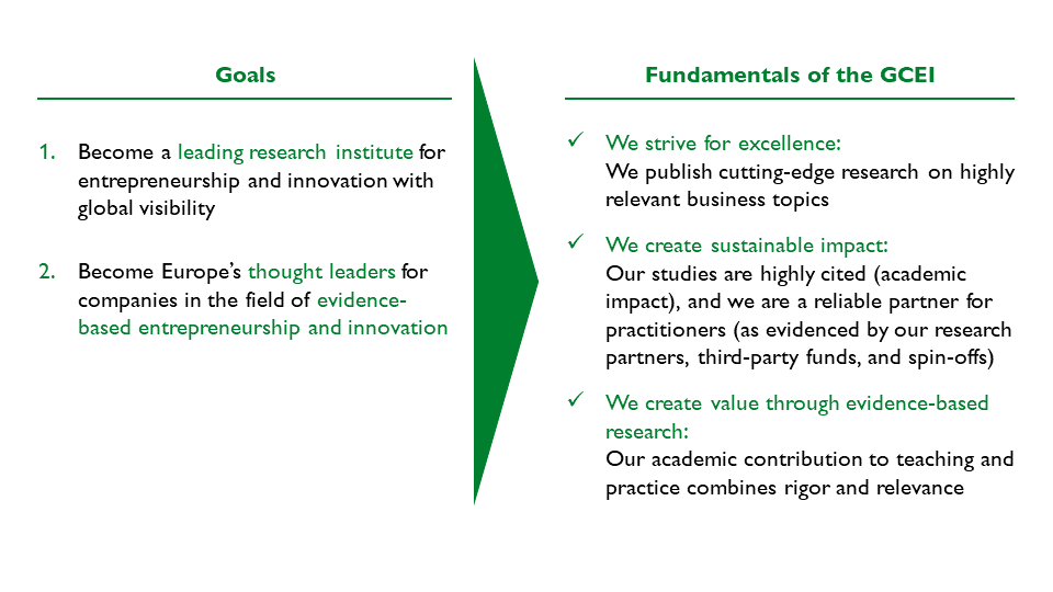 We are uniquely positioned to conduct research on a broad range of topics along the entrepreneurial life cycle: Our work on start-ups, business model innovation, firm growth, succession and entrepreneurial exit places our institute at the global forefront for entrepreneurship and innovation research. In particular, we pursue the following goals and fundamentals: